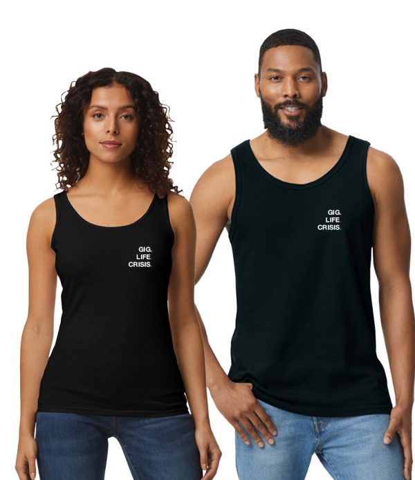 Elevate your gig wardrobe with our exclusive black cotton tank top, featuring the striking Gig Life Crisis logo prominently printed on the front top left. This stylish tee not only showcases your passion for live music but also makes a bold statement with 10 different slogans like, “There’s no such thing as attending too many concerts!” displayed in eye-catching white text at the top centre of the back.